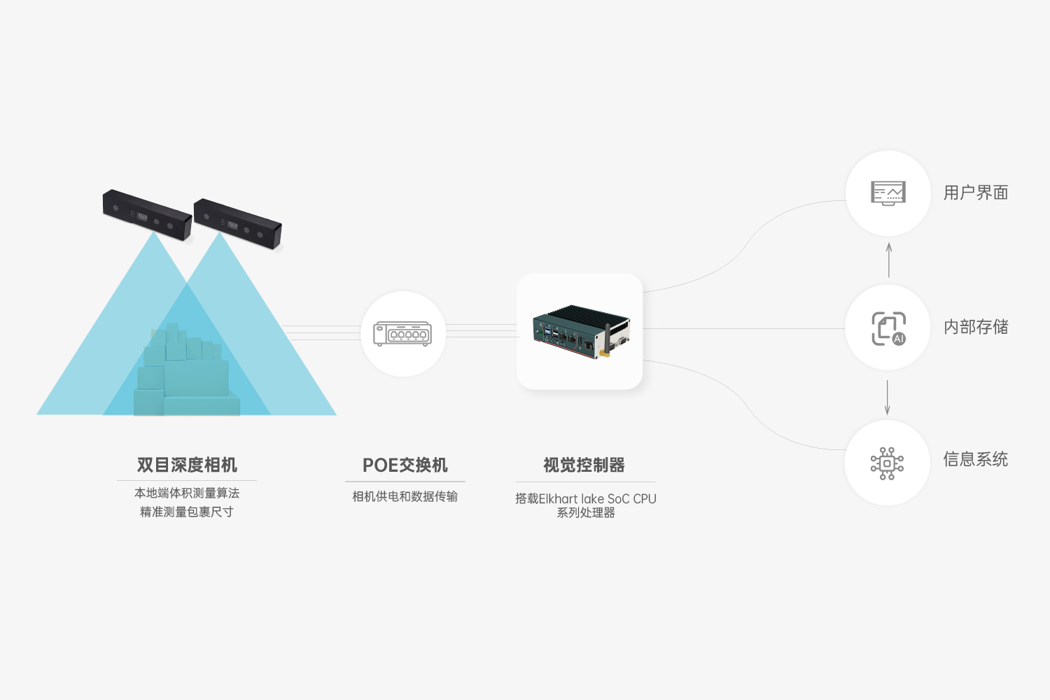 首页 动态 抖圈(中国)为du而生智能推出全新体积测量解决方案,赋能物流企业数字化降本增效 抖圈(中国)为du而生智能推出全新体积测量解决方案,赋能物流企业数字化降本增效 企业动态 2024-01-25 浏览量:2208 随着物流行业对精细化管理运营要求不断提升,包裹体积数据对企业提升测量效率和运输效率、优化存储空间及物流配送路线等方面均有重要意义。 物流行业传统采用人工测量方式,测量准确度受限于测量员的技术和经验,不确定性高,效率低,人力成本高,还存在隐形的员工管理成本,以及由于测量误差导致的仓储空间利用率低等问题。 如何进行精细化、自动化、智能化的体积数据采集,从而实现降本增效? 除纸箱等常见货物,对非规则、软包、高反光件、薄件等特殊形态包裹的精准测量,对多数体积测量制造企业提出更高的技术要求。 抖圈(中国)为du而生智能静态体积测量方案,基于6年技术沉淀,自主研发出HumanoidVisionTM技术,能够精准测量各种类型包裹体积,满足小件、大件、超大货物场景的体积测量需求,用智能赋能物流行业数字化升级。 多相机组合方案 抖圈(中国)为du而生智能采用主动双目立体成像技术,结合彩色摄像头输出高帧率RGB-D图像,通过自研的高精度体积测量算法,可以精准输出体积数据,满足仓储物流、商超、航空货站等场景下体积测量任务。 方案优势 01 测量精度高,传输稳定高效 稳定输出毫米级精准深度图,扫描帧率达8FPS; 司眸体积测量相机搭载了高精度算法和出色的硬件配置,适用全类型,多尺寸包裹测量场景; 千兆网络传输接口,抗干扰强,传输远,高频率传输数据时不掉线,不丢帧,数据传输稳定; RGBD实例分割算法,精准输出包裹的体积数据,平均测量精度可达5mm。 02 抗环境光干扰,适应性更强 支持光线变化场景下输出精准数据; 支持多曝光融合; 针对高反、强光、暗光场景优化体积测量深度数据; 03 安装范围广,调试易上手 单设备方案最大可支持1.8m高度安装;多设备方案最大可支持3.5m高度安装; 安装角度不严格限制为垂直(可偏差±5°); 接口简单,SDK集成简单,可供多平台SDK,方便二次开发。 应用场景 01 全类型包裹 适用于纸箱、异形件、软包、黑色包裹、高反光件(金属件、型材)、薄件(最低支持1mm薄件)等不同类型包裹的体积测量,一台设备兼具全类型包裹的体积信息采集,为业主提供更全能的解决方案。 02 多尺寸测量 #小件体积测量方案 抖圈(中国)为du而生体积测量单相机方案最小可测量50mm x 50mm x 1mm立方体,规则物体精度±5mm;不规则物体测量精度:±10mm,适用于小件包裹体积测量场景。 #单设备大件体积测量方案 抖圈(中国)为du而生体积测量相机内置高精度深度融合算法,具备大视场角,最大可测量1200mm x 1000mm x 1800mm 立方体,规则物体测量精度:±10mm;不规则物体测量精度:±20mm。针对快运行业的大件包裹,可快速精准完成快件的体积信息实时采集。 #方案可定制 抖圈(中国)为du而生智能还可针对特定货物测量场景定制方案,支持多台3D相机拼接,软件集成拼接算法,最大可测量1800mm x 1800mm x 1800mm 立方体;测量精度:±20mm,针对仓储物流,码垛类型的超大件物体进行体积测量。 上一个:抖圈(中国)为du而生智能助力连锁门店占领“客户心智” 返回列表 下一个:3D机器视觉可以完成许多2D机器视觉无法完成的任务。 更多新闻推荐 端到端 更易用丨抖圈(中国)为du而生®散料运输动态监测与预警系统全新上市 新品上市 2025-02-20 小尺寸 更灵活丨抖圈(中国)为du而生3D相机PEA020-800-Y80S上新,助力多场景智造升级 新品上市 2024-09-29 目前主流3D视觉技术各有什么优劣势?如何选择最Match的工业3D相机? 技术科普 2024-08-12 【最全选型攻略】挑选合适的工业相机,必须提前考虑12要素! 工业相机 2024-07-16 场景应用丨抖圈(中国)为du而生智能智能煤流监测系统全新升级,赋能自动化煤流管控 场景应用 2024-07-08 场景应用丨抖圈(中国)为du而生智能3D视觉+AI深度学习,助超大型货物体积测量更准,更稳,更易用 场景应用 2024-06-04