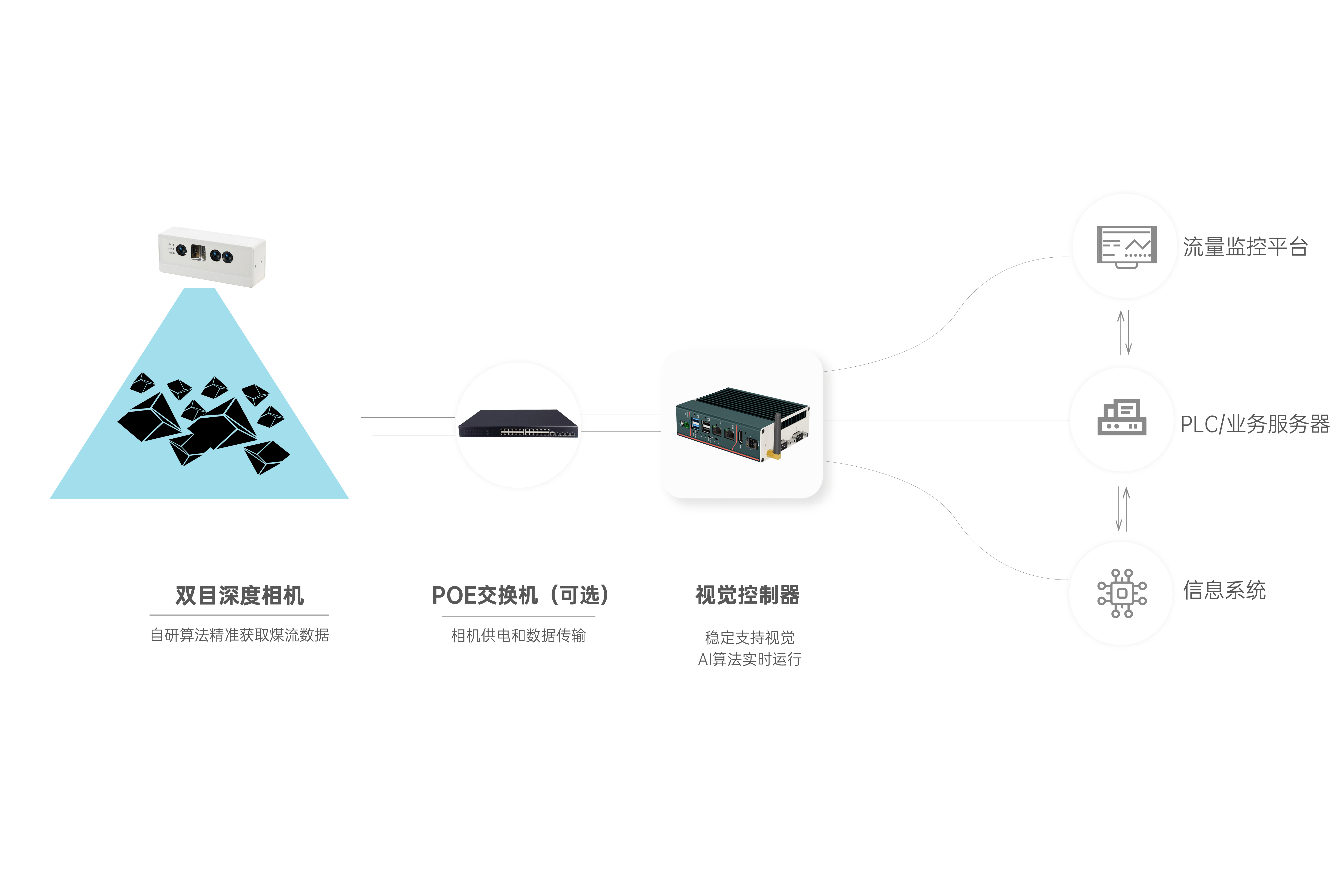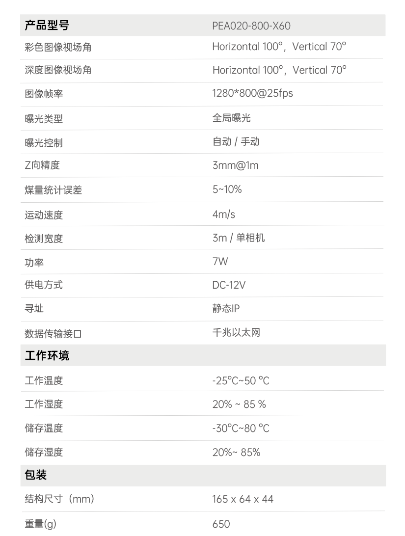 首页 动态 场景应用丨抖圈(中国)为du而生智能智能煤流监测系统全新升级,赋能自动化煤流管控 场景应用丨抖圈(中国)为du而生智能智能煤流监测系统全新升级,赋能自动化煤流管控 场景应用 2024-07-08 浏览量:2242 煤矿行业中,生产安全和节能降耗是两大痛点问题,在实际运煤过程中,跑偏、摩擦生热、堆煤、皮带撕裂等故障常造成重大安全事故,运输轻载和空载仍匀速运行会出现“以小拉大、无效运转”,导致能源大量浪费。 目前,传统测量设备智能化检测程度低,维护人员多,人力成本高,影响生产效率;皮带秤是采用较多的称重仪器,而在体积测量场景不易直接实现,而激光三维扫描测重系统价格昂贵,难以普遍使用。 如何通过提升皮带输送机采集精准数据能力,减人降耗,提高安全防范,进行自动化管控成为煤矿行业亟待解决的问题。 抖圈(中国)为du而生智能智能煤流监控管理系统,基于双目立体视觉技术实现精准的数据检测和输送带控制。系统由3D相机硬件、嵌入式计算平台、流量监测平台构成,实现输送带煤量监测统计,堆煤监测、块煤监测、异物监测、跑偏监测、撕裂监测等功能,以采集的精准数据为智能调速、皮带运输安全检测等智能化改造提供助力,达到减人增效,节能降耗的目标。该系统环境环境适应强,部署简单,无需改造现场环境即可安装。 司眸®智能煤流监测管理系统应用于某煤流监测项目 产品介绍 抖圈(中国)为du而生智能智能煤流监测管理系统采用自研非接触智能煤流RGBD相机,搭载输送机煤流监测智能管理平台,相机在AI算法加持下,能实时采集到高质量煤流RGBD数据,实现高速运输的煤炭皮带机进行多种智能化场景应用,易于部署,通过千兆网口直接对接PLC或服务器,安装便捷,无需改造现场环境,对环境光适应性强,不易受皮带颜色信息干扰。 系统应用功能 煤流统计 通过智能煤流RGBD相机采集动态输送机上的煤矿体积的三维数据,输出深度和彩色数据信息。该功能还可应用于输送带智能调速,生产数据管理,库存管理等智能化升级改造。 支持皮带速度:4m/s 粉煤煤量统计误差:≤5% 块煤监测 通过立体视觉技术,测量块状物的长宽数据,识别大块煤,输出高精度数据。 支持皮带速度:4m/s 异物监测 通过智能算法可识别大块矸石、铁器(锚杆、角钢)等非煤异物。 煤堆监测 在出料口、传送带上实时监测堆煤高度,实时输出堆煤结果。由此实现输送机安全监控,提前预防堆煤事故发生。 堆煤高度检测精度:毫米级 检测周期:秒级 最佳检测皮带宽度:600~2400mm 跑偏监测 根据智能相机安装位置定位皮带边缘位置,进行位置标定及设定跑偏阈值,通过获取的输送带三维尺寸位移信息,对皮带左右边缘位置与阈值比较并进行跑偏判断,输出跑偏结果。 左右皮带边缘定位精度:毫米级 检测周期:秒级 最佳检测皮带宽度:600~2400mm 智能煤流RGBD相机特点 01 高精度测量,保障数据准确 在高速动态检测上,测量精度可达毫米级,测量结果与实际煤量误差小于5%; 支持设备端断网续存,联网后相机前端与后台系统可保持数据同步。 02 适应性高,鲁棒性强,复杂场景可运行 抗强光、反光干扰:可抗强光、反光,自研算法支持煤矿等深色、黑色物体精准测量; 抗阴影干扰:在室内、地下、夜晚能稳定测量,无需补光; 多类型输送机适配:可适配平直型、U型、V型等各类型输送机; 适应于矿场粉尘、煤炭表面有水渍的情况; 结合算法对皮带输送时产生的震动进行自适应调整,减少测量误差; 针对井下场景可选用防爆硬件及井上应用工业级硬件设备,满足应用需求。 03 部署简单,安装便捷 出厂相机内参标定,可快速部署集成,无需改变现场环境即可安装,实施速度快,调试简单,系统易于维护。 04 接口丰富,数据直传 丰富的系统对接接口,可直接对接PLC、变频器、服务器,快速完成精细化皮带控制。 05 大景深、大视野,多范围应用 测量皮带宽度达2.4米; 测量煤堆高度达1.5米; 设备组合方案可支持更大视野。 05 边缘计算架构,实时测量 使用边缘计算架构,将多种智能算法在边缘端实现,保证数据实时传输。 RGBD相机参数 抖圈(中国)为du而生智能深耕机器视觉领域近十年,垂直领域技术积累深厚,经过长期自主研发,现已推出系列体积测量方案,包括智能煤流监测管理系统、RGBD大货体积测量、动态包裹体积测量、静态包裹体积测量等,能够满足各领域不断增加的业务需求。 我们一直秉持以服务客户为中心,将技术与产品创新作为对客户、行业和社会应尽的责任。未来,抖圈(中国)为du而生智能将坚持科技创新,始终致力于数字化转型升级及智能化发展,促进全社会生产效益提升。 上一个:场景应用丨抖圈(中国)为du而生智能3D视觉+AI深度学习,助超大型货物体积测量更准,更稳,更易用 返回列表 下一个:3D机器视觉可以完成许多2D机器视觉无法完成的任务。 更多新闻推荐 端到端 更易用丨抖圈(中国)为du而生®散料运输动态监测与预警系统全新上市 新品上市 2025-02-20 小尺寸 更灵活丨抖圈(中国)为du而生3D相机PEA020-800-Y80S上新,助力多场景智造升级 新品上市 2024-09-29 目前主流3D视觉技术各有什么优劣势?如何选择最Match的工业3D相机? 技术科普 2024-08-12 【最全选型攻略】挑选合适的工业相机,必须提前考虑12要素! 工业相机 2024-07-16 场景应用丨抖圈(中国)为du而生智能3D视觉+AI深度学习,助超大型货物体积测量更准,更